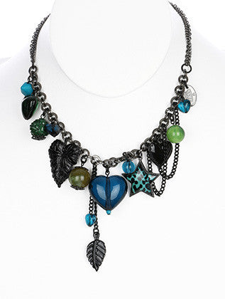 NECKLACE / DOUBLE CHAIN / CHUNKY CHARM BIB / METAL LEAF / HEART / LUCITE / ROSE / STAR / BEAD / LINK / CHAIN / 16 INCH LONG / 3 INCH DROP / NICKEL AND LEAD COMPLIANT