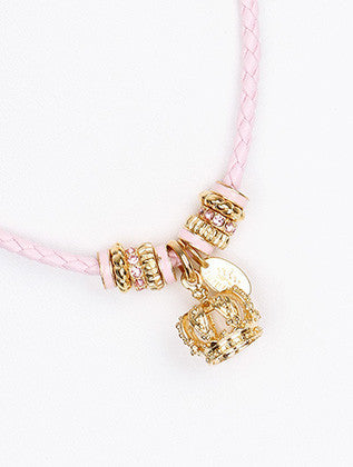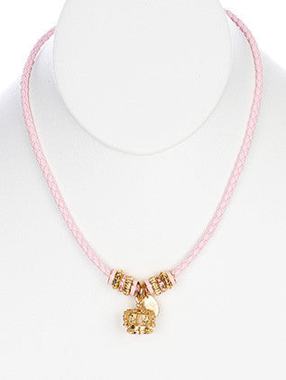 NECKLACE / BRAIDED CORD / METAL CROWN PENDANT / CUTOUT / METALLIC RING BEAD / CRYSTAL STONE / EPOXY COAT / TWISTED / TEXTURED / 16 INCH LONG / 1 INCH DROP / NICKEL AND LEAD COMPLIANT