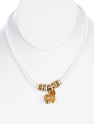 NECKLACE / BRAIDED CORD / METAL CROWN PENDANT / CUTOUT / METALLIC RING BEAD / CRYSTAL STONE / EPOXY COAT / TWISTED / TEXTURED / 16 INCH LONG / 1 INCH DROP / NICKEL AND LEAD COMPLIANT