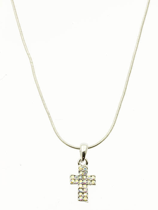 NECKLACE / PAVE CRYSTAL STONE / CROSS / CHAIN / 16 INCH LONG / 1 INCH DROP / NICKEL AND LEAD COMPLIANT