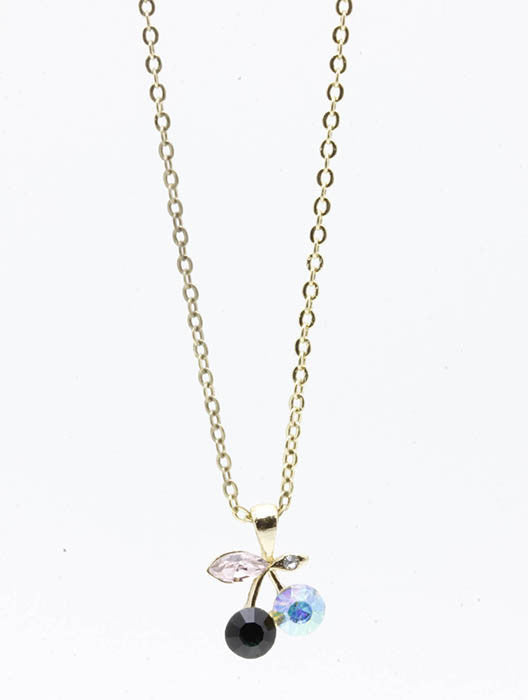NECKLACE / CRYSTAL STONE / METAL CHERRY PENDANT / AURORA / LINK / CHAIN / 16 INCH LONG / 1/2 INCH DROP / NICKEL AND LEAD COMPLIANT