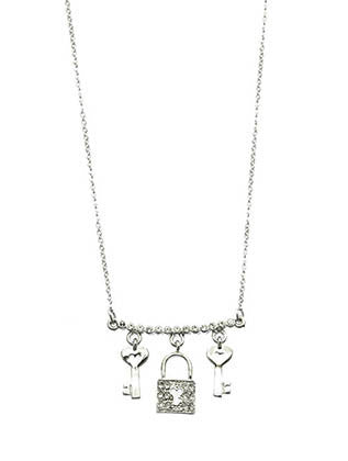 NECKLACE / PAVE CRYSTAL STONE / LOCKET AND KEY CHARM / METAL / LINK / CHAIN / 16 INCH LONG / 3/4 INCH DROP / NICKEL AND LEAD COMPLIANT