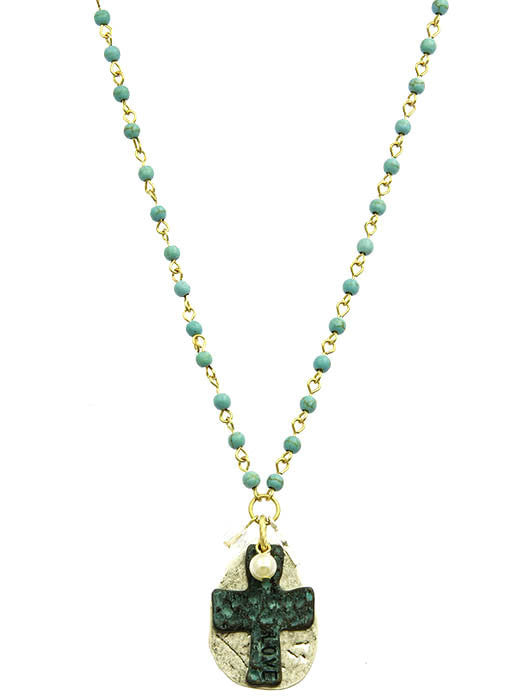 NECKLACE / TWO TONE METAL / CROSS PENDANT / LOVE / HAMMERED METAL / PEARL / LUCITE BEAD / NATURAL STONE FINISH / LINK / CHAIN / 16 INCH LONG / 1 3/4 INCH DROP / NICKEL AND LEAD COMPLIANT