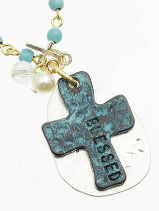 NECKLACE / TWO TONE METAL / CROSS PENDANT / BLESSED / HAMMERED METAL / PEARL / LUCITE BEAD / NATURAL STONE FINISH / LINK / CHAIN / 16 INCH LONG / 1 3/4 INCH DROP / NICKEL AND LEAD COMPLIANT