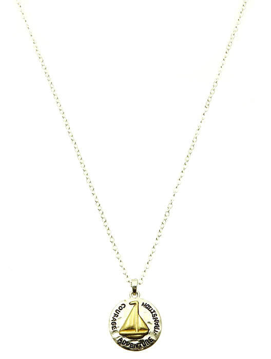 NECKLACE / SAILBOAT / HAMMERED METAL PENDANT / TWO TONE / MESSAGE / COURAGE / ADVENTURE / TRANSITION / LINK / CHAIN / 18 INCH LONG / 1 INCH DROP / NICKEL AND LEAD COMPLIANT