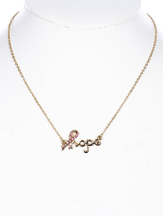 NECKLACE / BREAST CANCER AWARENESS / LINK / METAL / CRYSTAL STONE PAVED / MESSAGE / HOPE / 3/4 INCH DROP / 18 INCH LONG / NICKEL AND LEAD COMPLIANT