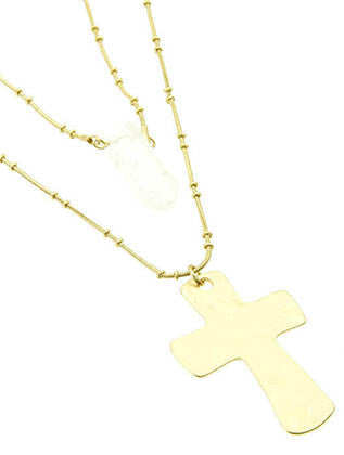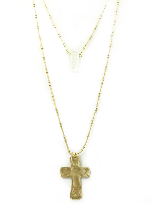 NECKLACE / NATURAL STONE / CROSS / BOURBON AND BOWETIES INSPIRTED / HAMMERED METAL / MATTE FINISH / BRASS / 22 INCH LONG / 6 1/2 INCH DROP / NICKEL AND LEAD COMPLIANT
