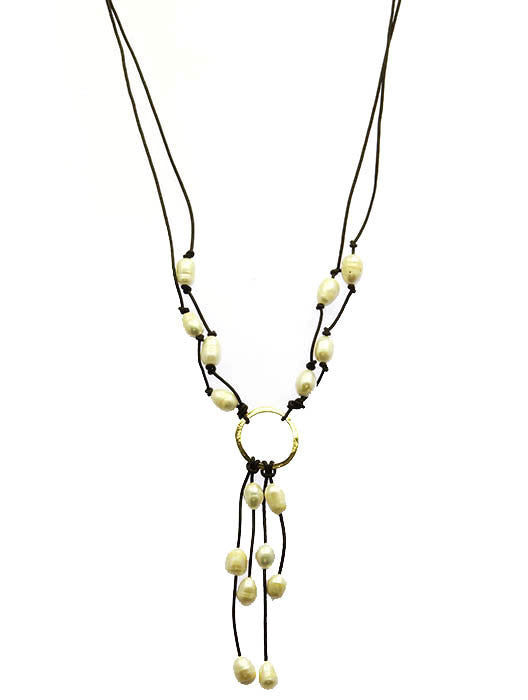 NECKLACE / DOUBLE CORD / FRINGE / METAL RING / METALLIC FINISH BEAD / 34 INCH LONG / 4 INCH DROP / NICKEL AND LEAD COMPLIANT