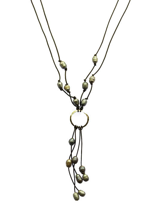 NECKLACE / DOUBLE CORD / FRINGE / METAL RING / METALLIC FINISH BEAD / 34 INCH LONG / 4 INCH DROP / NICKEL AND LEAD COMPLIANT