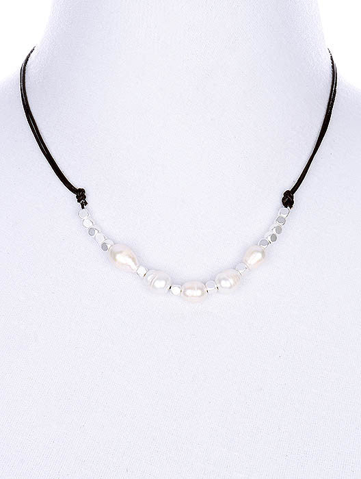 NECKLACE / KNOTTED DOUBLE CORD / PEARL BIB / METALLIC BEAD / LOOP CLOSURE / 16 INCH LONG / 1/2 INCH DROP / NICKEL AND LEAD COMPLIANT