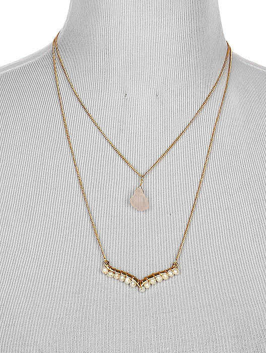 NECKLACE / NATURAL STONE AND PEARL / DOUBLE LAYER / METAL ROD / LINK / CHAIN / 18 INCH LONG / 2 1/2 INCH DROP / NICKEL AND LEAD COMPLIANT