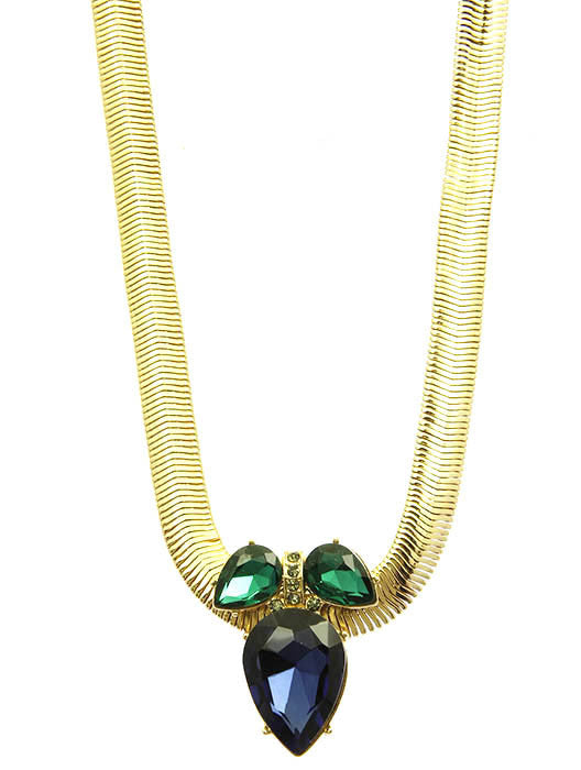 NECKLACE / FACETED HOMAICA STONE / SNAKE CHAIN / PEAR CUT / PAVE CRYSTAL STONE / 16 INCH LONG / 1 1/2 INCH DROP / NICKEL AND LEAD COMPLIANT
