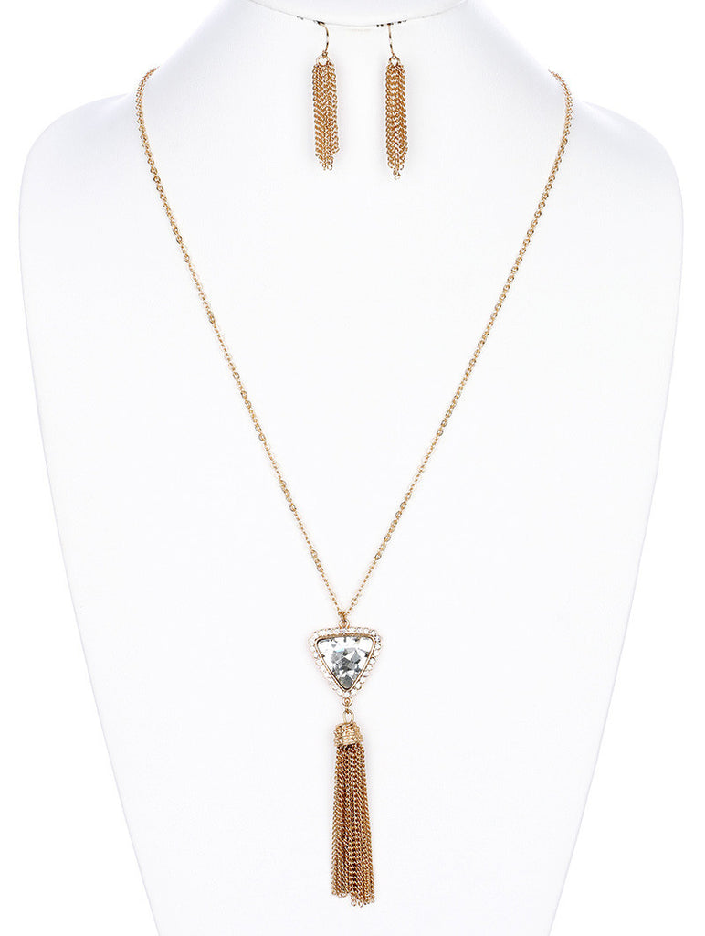 NECKLACE / TRIANGULAR / FACETED GLASS STONE / PAVE CRYSTAL STONE / TASSEL / TEXTURED METAL / METAL CHAIN / 26 INCH LONG / 4 INCH DROP / NICKEL AND LEAD COMPLIANT