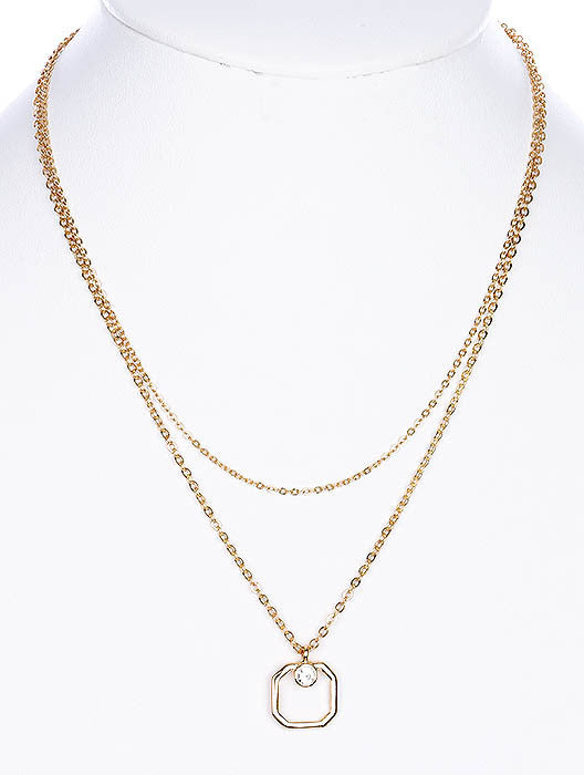 NECKLACE / DOUBLE LAYERED / ASSCHER SHAPED PENDANT / CRYSTAL STONE / LINK / CHAIN / 16 INCH LONG / 1 3/4 INCH DROP / NICKEL AND LEAD COMPLIANT