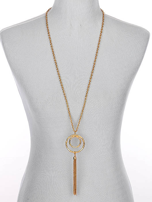 NECKLACE / HAMMERED METAL DOUBLE RING / CHAIN TASSEL / TWO TONE / WRAPAROUND WIRE / LINK / CHAIN / 34 INCH LONG / 6 1/2 INCH DROP / NICKEL AND LEAD COMPLIANT