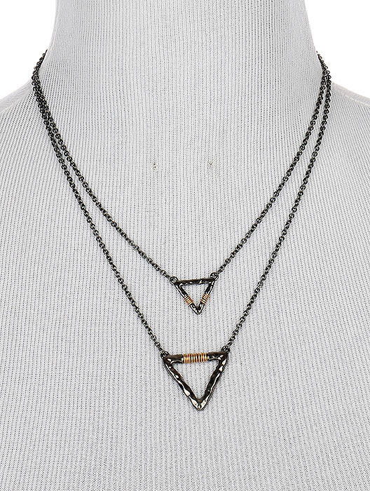 NECKLACE / HAMMERED METAL / DOUBLE LAYER / TRIANGULAR CUTOUT METAL / TWO TONE / WRAPAROUND WIRE / LINK / CHAIN / 16 INCH LONG / 2 INCH DROP / NICKEL AND LEAD COMPLIANT