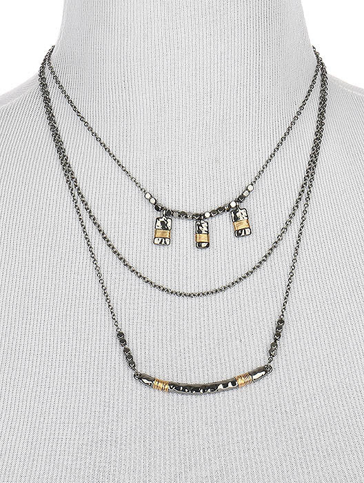 NECKLACE / HAMMERED METAL ROD / THREE LAYER / METALLIC BEAD / TWO TONE / WRAPAROUND WIRE / LINK / CHAIN / 16 INCH LONG / 2 1/2 INCH DROP / NICKEL AND LEAD COMPLIANT