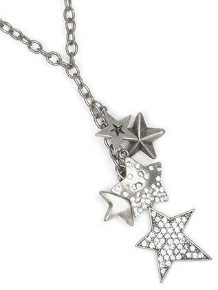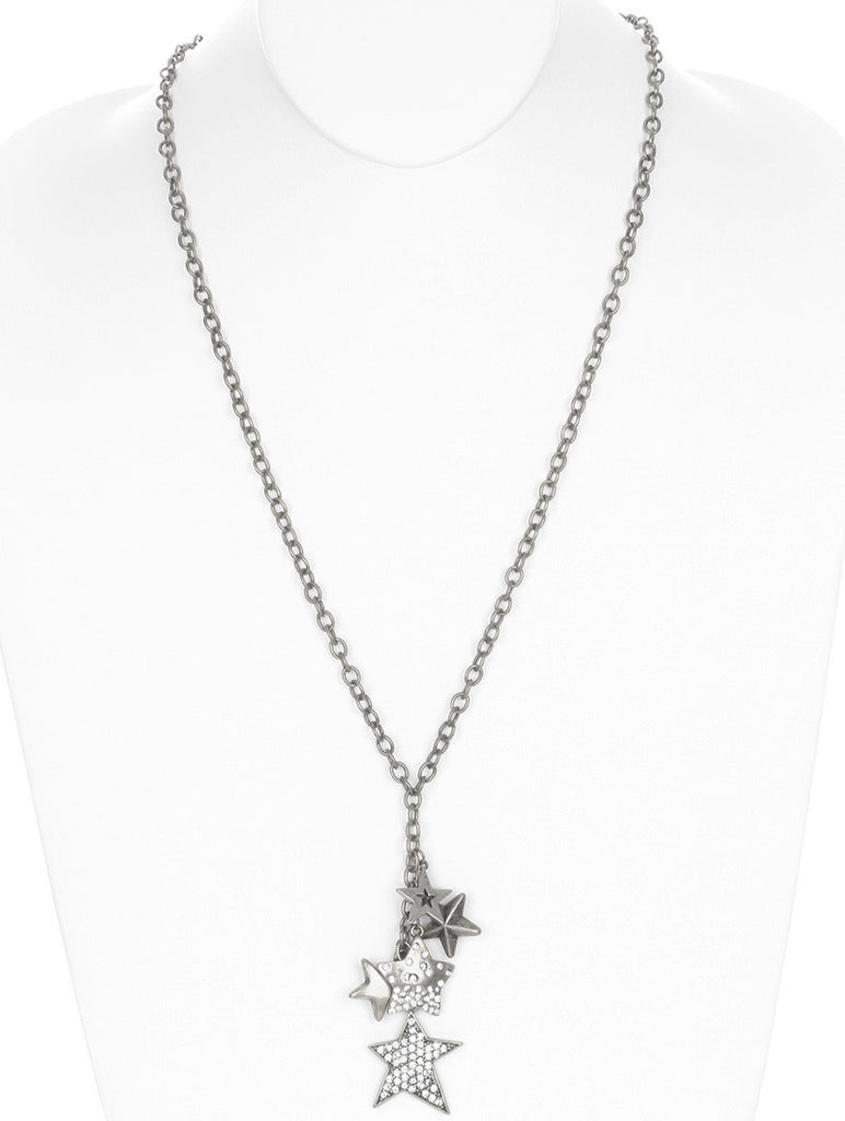 NECKLACE / AGED FINISH METAL / STAR CHARM LONG / PAVE CRYSTAL STONE / CUTOUT / LINK / CHAIN / 28 INCH LONG / 4 INCH DROP / NICKEL AND LEAD COMPLIANT