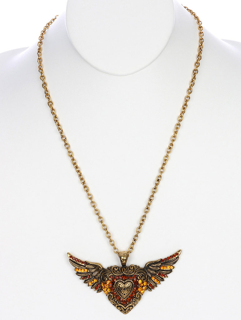NECKLACE / AGED FINISH METAL / WINGED HEART PENDANT / SPIRAL ETCHED / GLASS STONE / LINK / CHAIN / 22 INCH LONG / 2 INCH DROP / NICKEL AND LEAD COMPLIANT