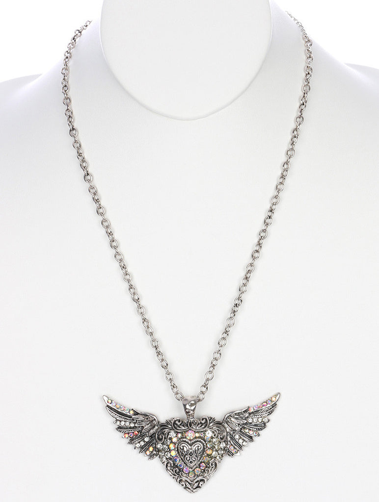NECKLACE / AGED FINISH METAL / WINGED HEART PENDANT / SPIRAL ETCHED / AURORA STONE / LINK / CHAIN / 22 INCH LONG / 2 INCH DROP / NICKEL AND LEAD COMPLIANT
