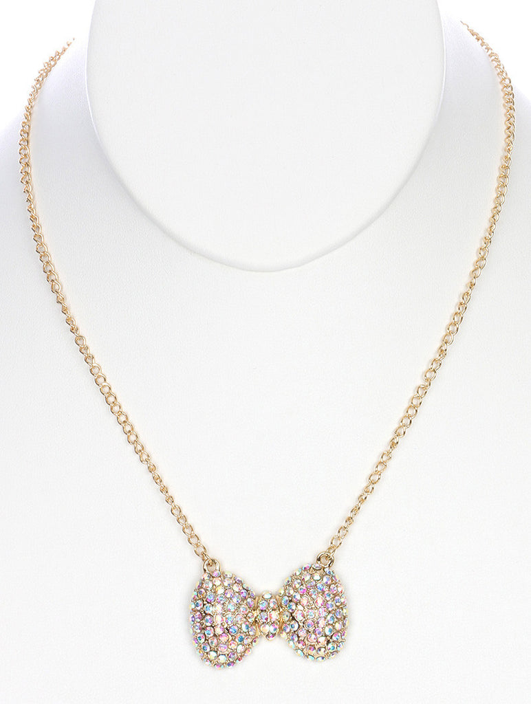 NECKLACE / PAVE AURORA STONE / TEXTURED METAL BOW / LINK / CHAIN / 16 INCH LONG / 1 INCH DROP / NICKEL AND LEAD COMPLIANT