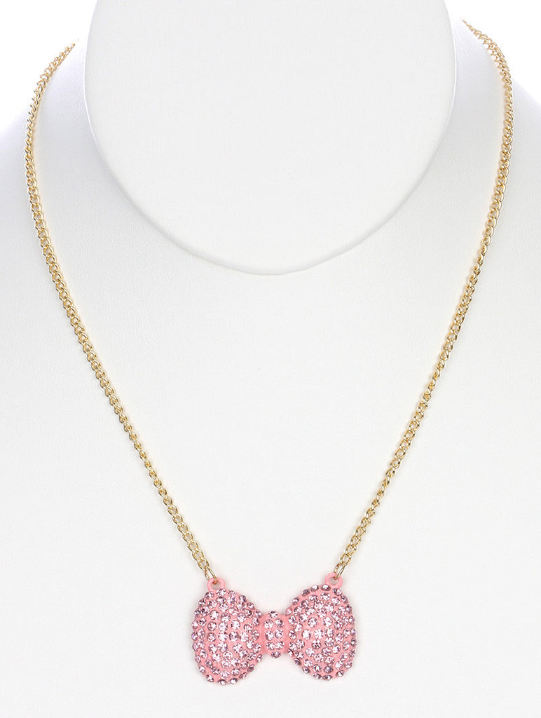NECKLACE / PAVE CRYSTAL STONE / TEXTURED METAL BOW / EPOXY COAT / LINK / CHAIN / 16 INCH LONG / 1 INCH DROP / NICKEL AND LEAD COMPLIANT