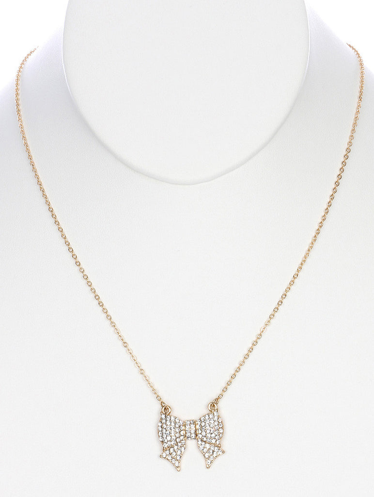 NECKLACE / PAVE CRYSTAL STONE / METAL BOW PENDANT / LINK / CHAIN / 16 INCH LONG / 1 INCH DROP / NICKEL AND LEAD COMPLIANT