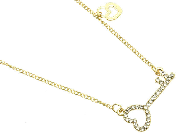 NECKLACE / LINK / METAL / CRYSTAL STONE PAVED / KEY / HEART / 1/3 INCH DROP / 16 INCH LONG / NICKEL AND LEAD COMPLIANT