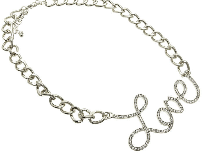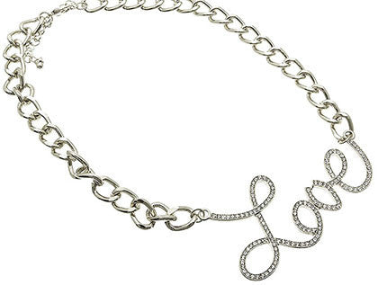 NECKLACE / LINK / METALCHAIN / CRYSTAL STONE PAVED / MESSAGE / LOVE / 1 1/3 INCH DROP / 16 INCH LONG / NICKEL AND LEAD COMPLIANT