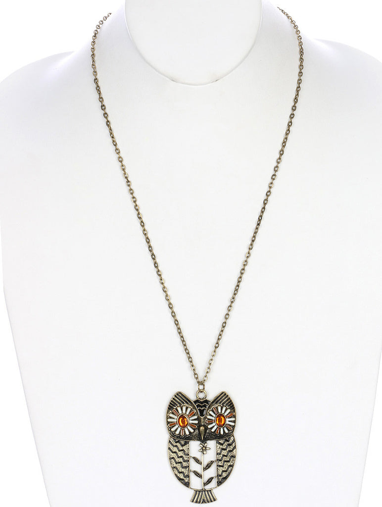 NECKLACE / AGED FINISH METAL / OWL PENDANT / LUCITE STONE / FLOWER / CUTOUT / PATTERN / ETCHED / EPOXY COAT / LINK / CHAIN / 28 INCH LONG / 3 INCH DROP / NICKEL AND LEAD COMPLIANT