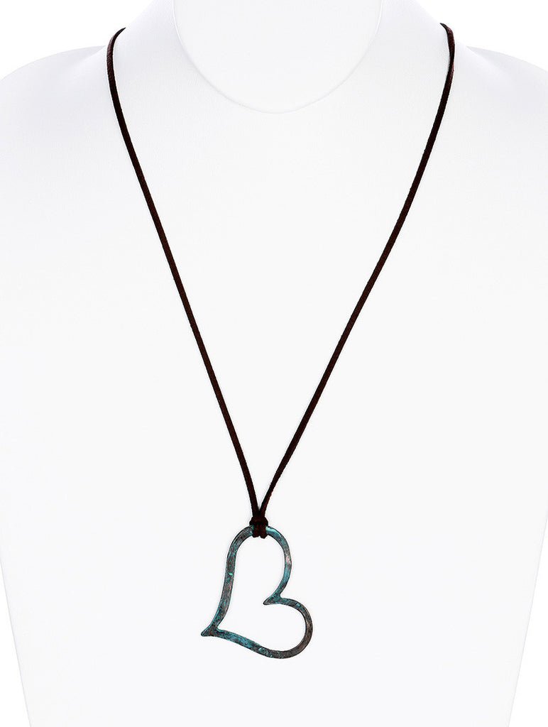 NECKLACE / AGED FINISH METAL / HEART PENDANT / CUTOUT / HAMMERED / FAUX SUEDE / 30 INCH LONG / 2 1/4 INCH DROP / NICKEL AND LEAD COMPLIANT