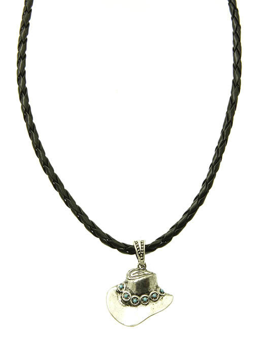 NECKLACE / AGED FINISH / COWBOY HAT / TEXTURED METAL / MICRO BEAD / BRAIDED CORD / 14 INCH LONG / 1 1/4 INCH DROP / NICKEL AND LEAD COMPLIANT