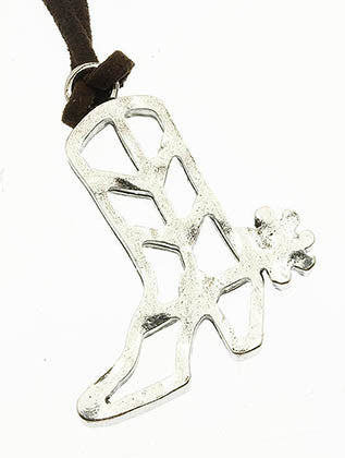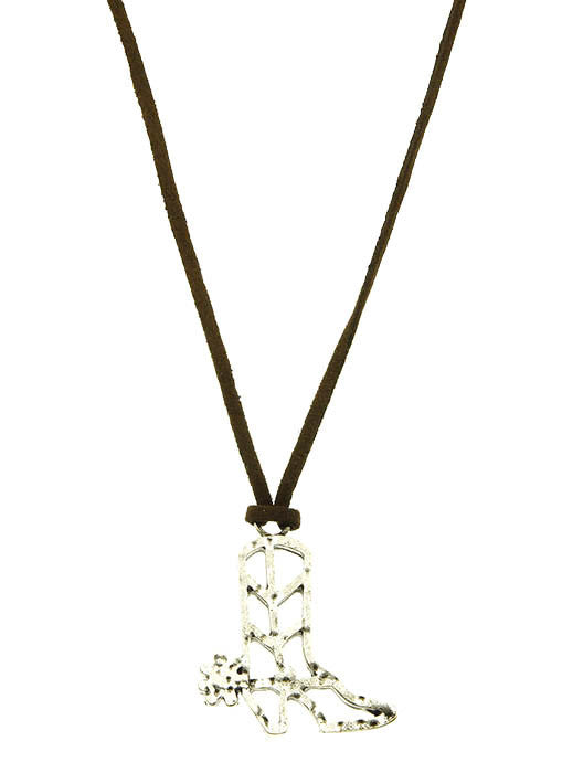 NECKLACE / COWBOY BOOT / HAMMERED METAL / PRIDE / ADJUSTABLE / FAUX SUEDE STRAND / 30 INCH LONG / 2 INCH DROP / NICKEL AND LEAD COMPLIANT