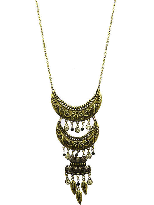 NECKLACE / BOHEMIAN STYLE / TEXTURED CRESCENT METAL / AGED FINISH / LEAF / CRYSTAL STONE / LINK / CHAIN / 28 INCH LONG / 5 1/2 INCH DROP / NICKEL AND LEAD COMPLIANT