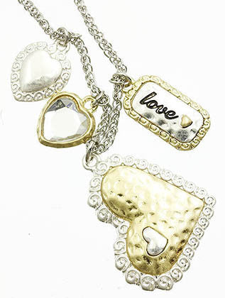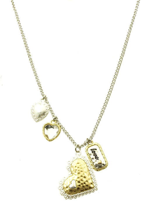 NECKLACE / HAMMERED METAL / HEART / CHARM / LOVE/ CRYSTAL STONE / METAL CHAIN / 18 INCH LONG / 1 1/2 INCH DROP / NICKEL AND LEAD COMPLIANT