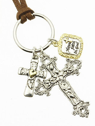 NECKLACE / TWO TONE METAL / CROSS CHARM / FAUX SUEDE STRAND / TEXTURED / MESSAGE / HAVE FAITH IN GOD / AGED FINISH / 30 INCH LONG / 2 1/2 INCH DROP / NICKEL AND LEAD COMPLIANT