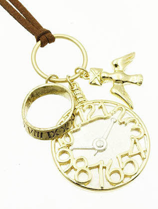 NECKLACE / TWO TONE METAL / CLOCK PENDANT / MESSENGER DOVE / FAUX SUEDE STRAND / 26 INCH LONG / 2 3/4 INCH DROP / NICKEL AND LEAD COMPLIANT
