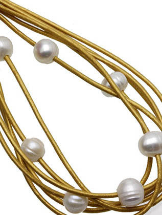 NECKLACE / MULTI FAUX LEATHER CORD / PEARL / METALLIC / 18 INCH LONG / 1/2 INCH DROP / NICKEL AND LEAD COMPLIANT