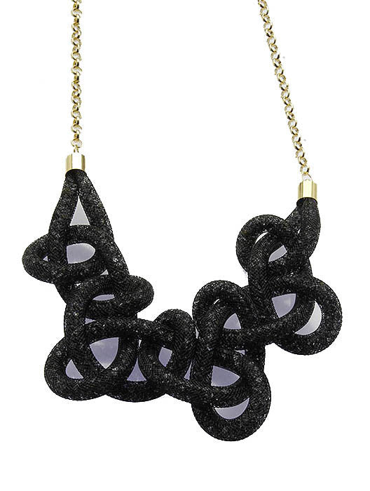 NECKLACE / INTERTWINED MESH CORD / BIB / LUCITE BEAD / LINK / CHAIN / 14 INCH LONG / 2 1/2 INCH DROP / NICKEL AND LEAD COMPLIANT