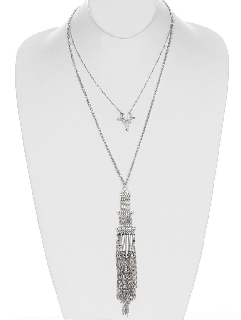 NECKLACE / LAYERED BOHEMIAN STYLE / METAL / TASSEL CHAIN FRINGE / MICRO BEAD / 20 INCH LONG / 10 INCH DROP / NICKEL AND LEAD COMPLIANT