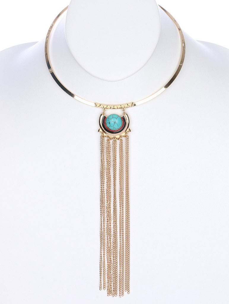 NECKLACE / METAL CHAIN CHOKER / NATURAL STONE / CHAIN FRINGE / STUD / 5 1/4 INCH DIAMETER / 7 INCH DROP / NICKEL AND LEAD COMPLIANT