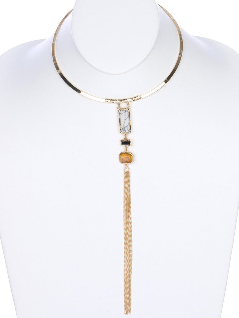 NECKLACE / METAL CHAIN CHOKER / NATURAL STONE/ GLASS STONE / CHAIN FRINGE / 5 1/4 INCH DIAMTER / 8 1/4 INCH DROP / NICKEL AND LEAD COMPLIANT