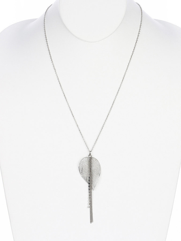 NECKLACE / FILIGREE / METAL LEAF / RHINESTONE CHAIN FRINGE / CUTOUT / 24 INCH LONG / 4 INCH DROP / NICKEL AND LEAD COMPLIANT