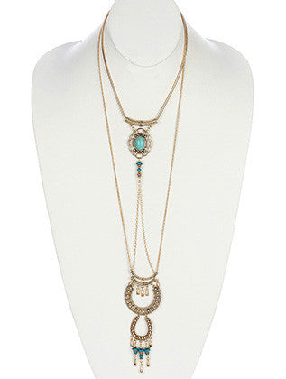 NECKLACE / BOHEMIAN STYLE / LAYERED / NATURAL OVAL STONE / CUTOUT FLOWER FRAME / AGED FINISH METAL / TEXTURED / LUCITE BEAD / METALLIC BEAD FRINGE / LINK / SNAKE CHAIN / 16 INCH LONG / 12 1/4 INCH DROP / NICKEL AND LEAD COMPLIANT