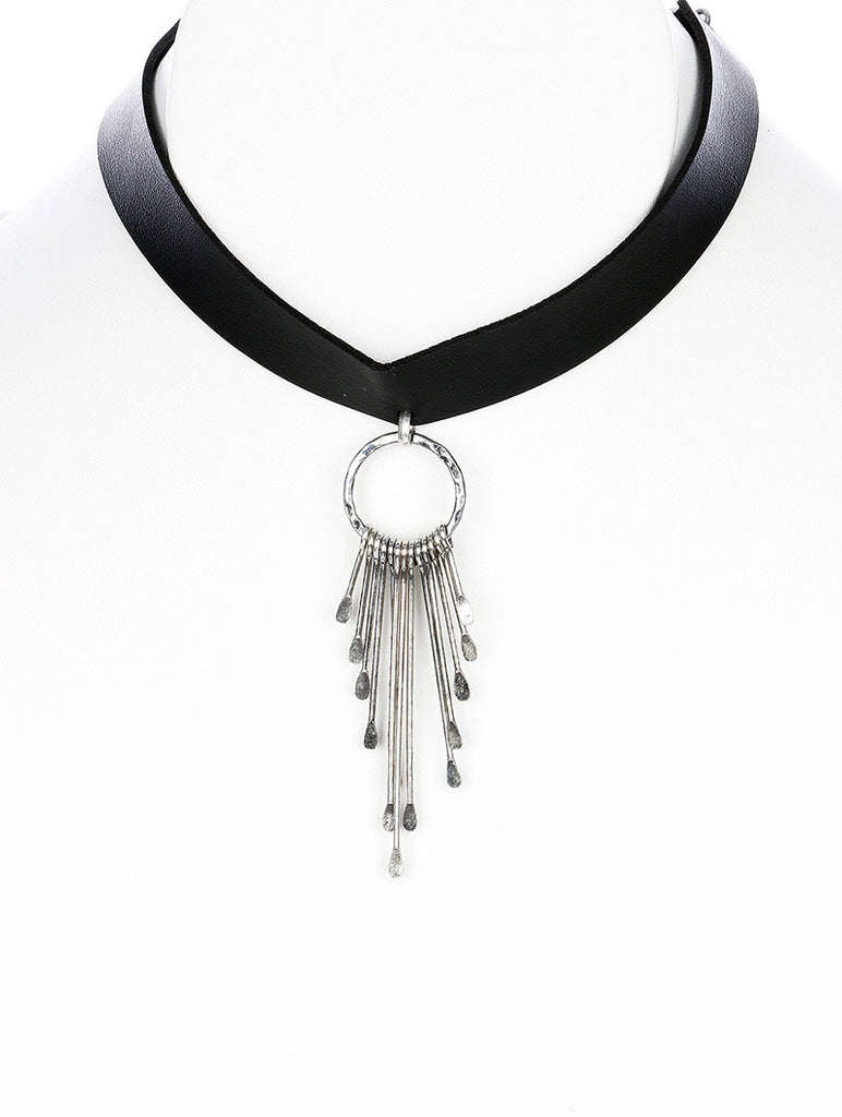 NECKLACE / METAL NEEDLE FRINGE / FAUX LEATHER CHOKER / HAMMERED RING / AGED FINISH / 10 INCH LONG / 3 1/4 INCH DROP / NICKEL AND LEAD COMPLIANT