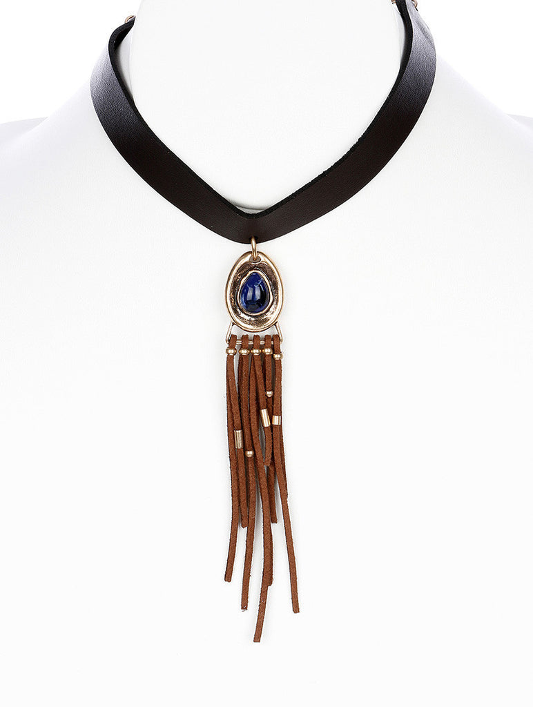 NECKLACE / SUEDE FRINGE / FAUX LEATHER CHOKER / TEARDROP NATURAL STONE / AGED FINISH / HAMMERED METAL FRAME / 10 INCH LONG / 5 1/2 INCH DROP / NICKEL AND LEAD COMPLIANT