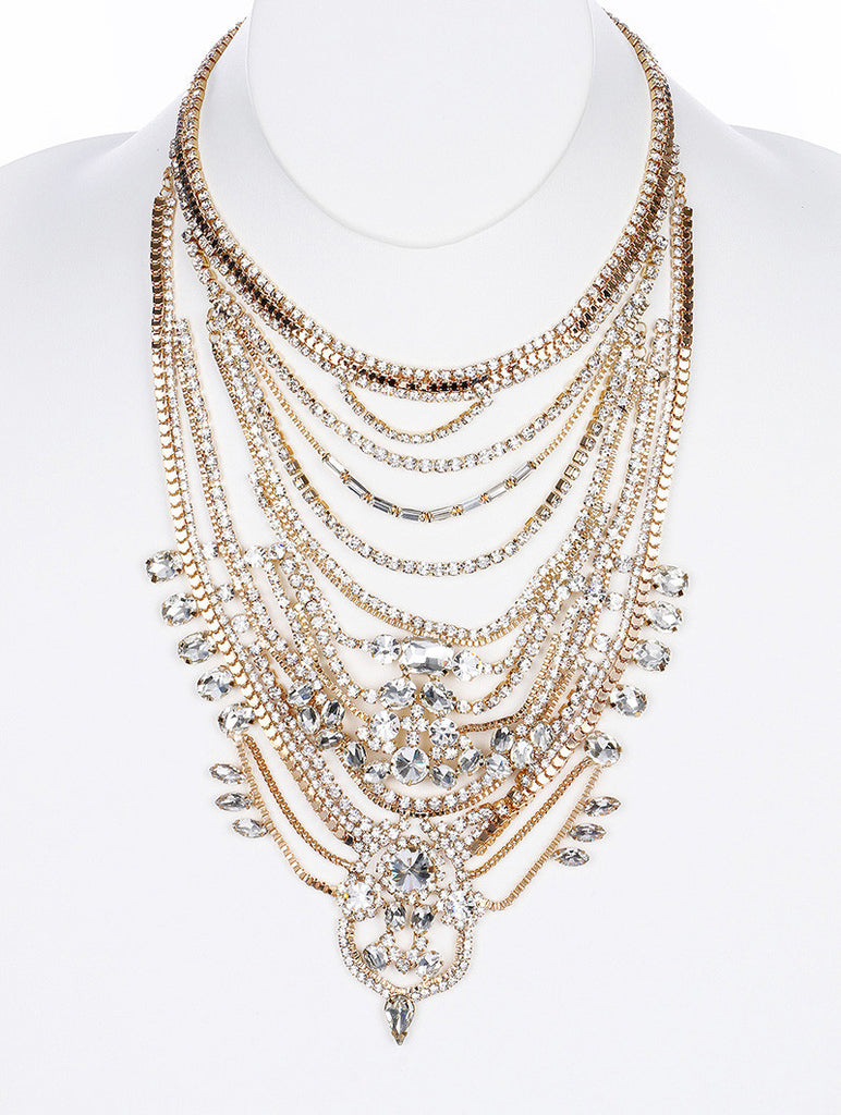 NECKLACE / VINTAGE STYLE / STATEMENT BIB / CRYSTAL / RHINESTONE / MULTI CHAIN / MULTI LAYER / 12 INCH LONG / 7 INCH DROP / NICKEL AND LEAD COMPLIANT