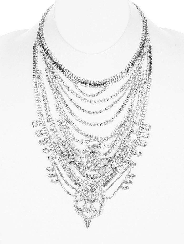 NECKLACE / VINTAGE STYLE / STATEMENT BIB / CRYSTAL / RHINESTONE / MULTI CHAIN / MULTI LAYER / 12 INCH LONG / 7 INCH DROP / NICKEL AND LEAD COMPLIANT