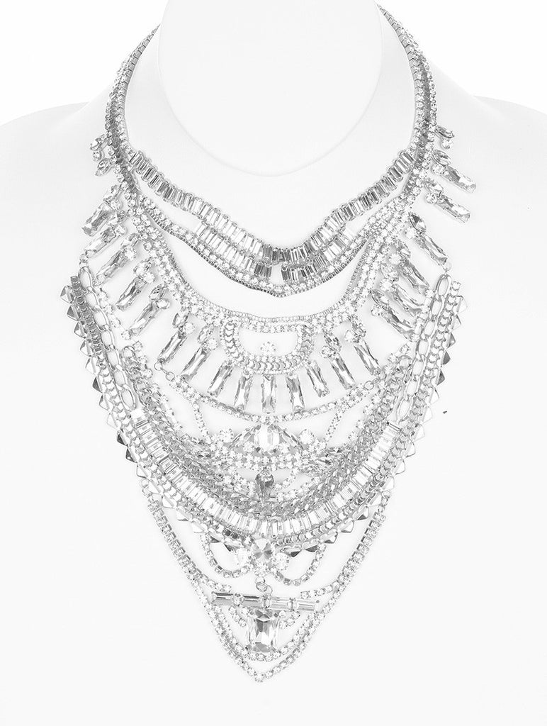 NECKLACE / VINTAGE STYLE / STATEMENT BIB / CRYSTAL / RHINESTONE / MULTI CHAIN / MULTI LAYER / 12 INCH LONG / 6 INCH DROP / NICKEL AND LEAD COMPLIANT