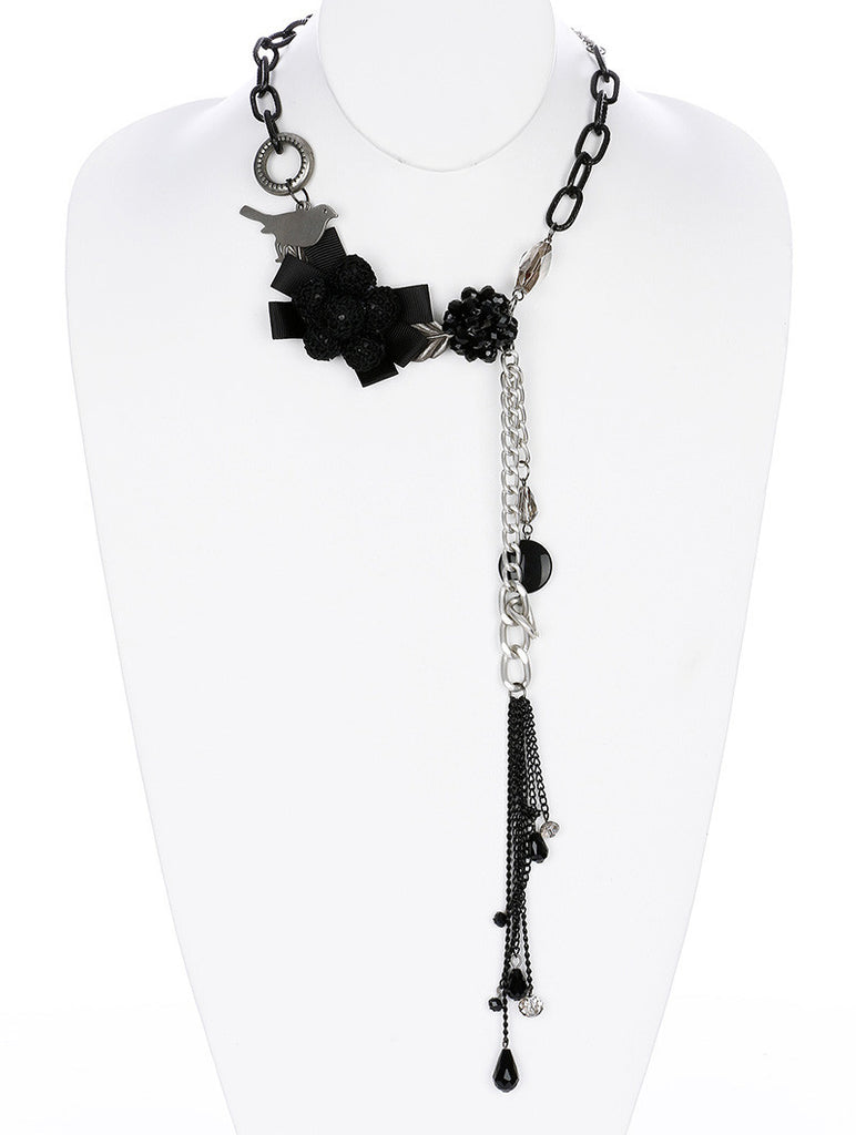 NECKLACE / LOVEBIRD CHARMS / LINK / METAL / BURNISH / LEATHER / LUCITE BEAD / FACETED GLASS BEAD / 4 1/2 INCH DROP / 18 INCH LONG / NICKEL AND LEAD COMPLIANT